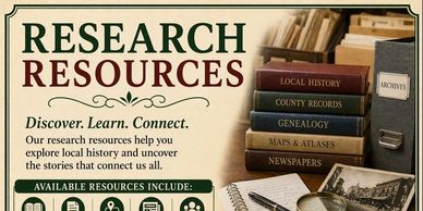 We have a resource room that contains files on families, businesses, churches, schools, military, and so much more. We also have photo archives for added research. Online research resources can be found by clicking the link below.